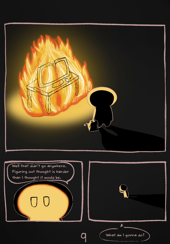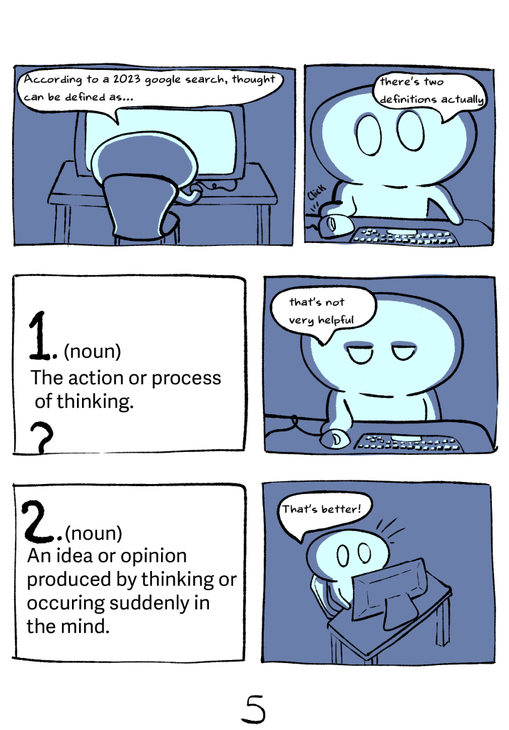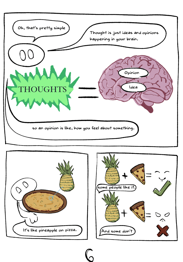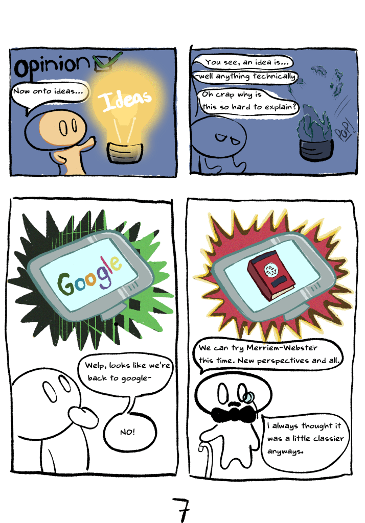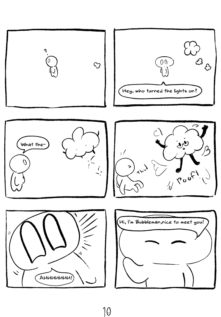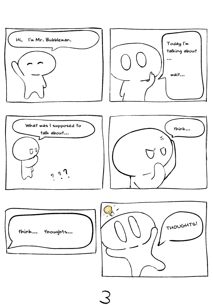 Premise: Bubbleman, who is dialogue personified, explores the concept of human thought, along with Dr. Thought, the personification of thought. Together they realize the complexities and nuances of the way our brains operate. On their journey, they meet emotions such as sorrow and joy, navigate mental health issues such as anxiety and depression, learn about mind altering substances, and subvert almost every graphic novel trope along the way.
